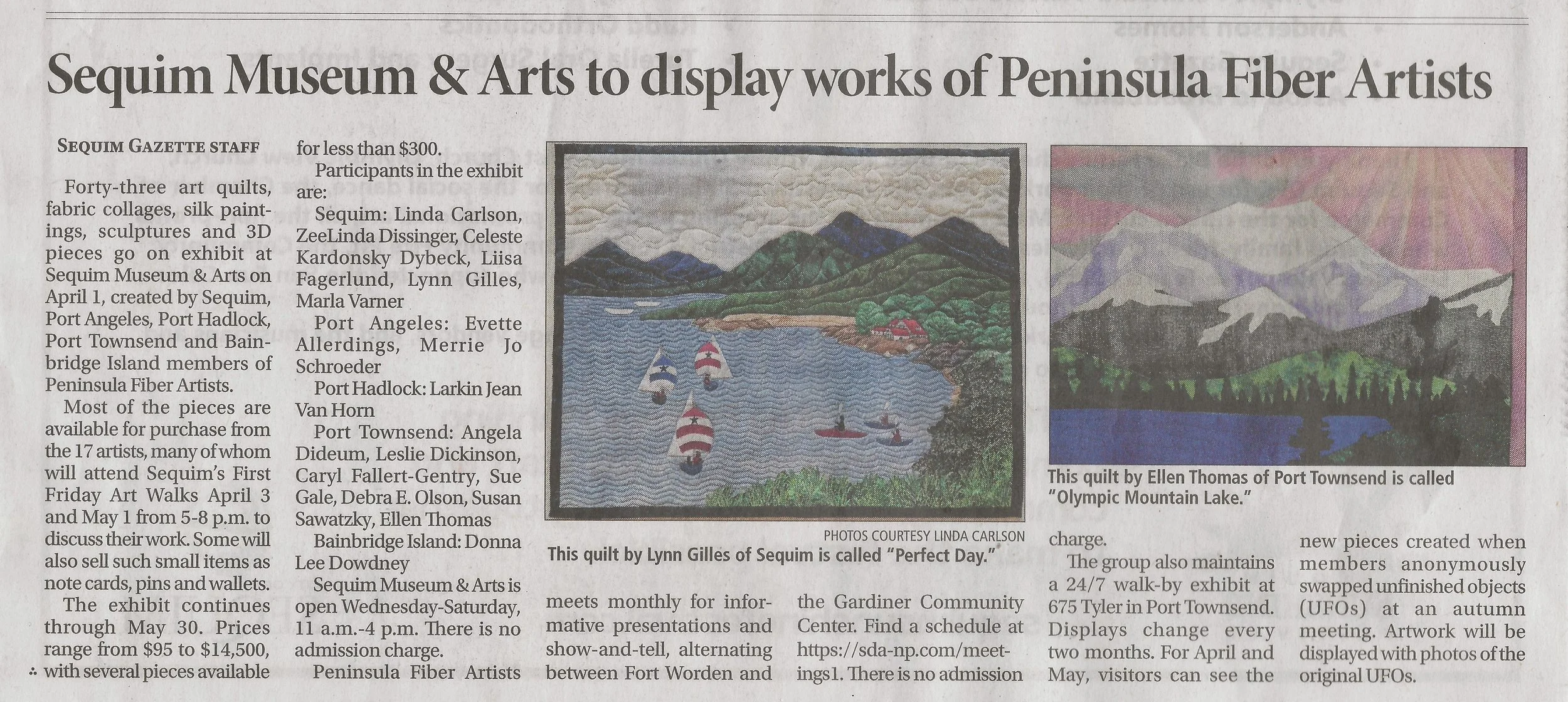 “Color Play” includes pieces by Sequim artists Linda Carlson, Kathie Cook, Liisa Fagerlund, Lynn Gilles and Susan Melka, Port Angeles artists Evette Allerdings and Michelle Johnson, Port Townsend artists Leslie Dickinson, Caryl Bryer Fallert-Gentry, Sue Gale, Annie Karl, Kindy Kemp, Cynthia LeRouge and Debra E. Olson, Nordland artist Susan Sawatzky, Port Hadlock artist Larkin Van Horn, Bainbridge Island artist Donna Lee Dowdney, and Poulsbo artist Daera Dobbs.